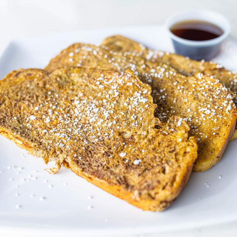 3 slices of challah bread battered and sprinkled with powdered sugar