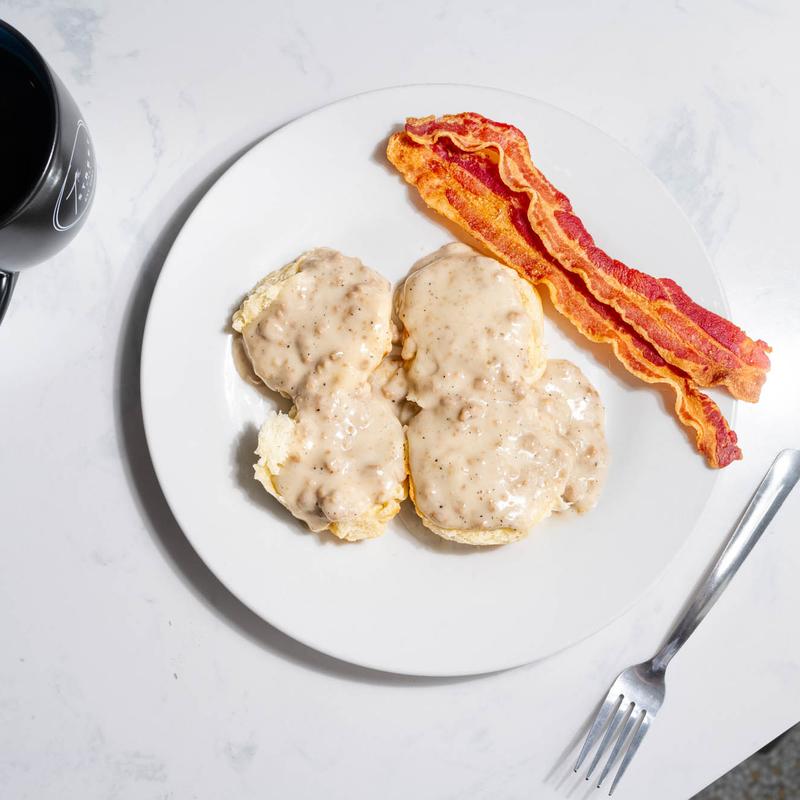 Choice of ham or bacon, mozzarella, roasted potatoes, eggs (topped with sausage gravy)