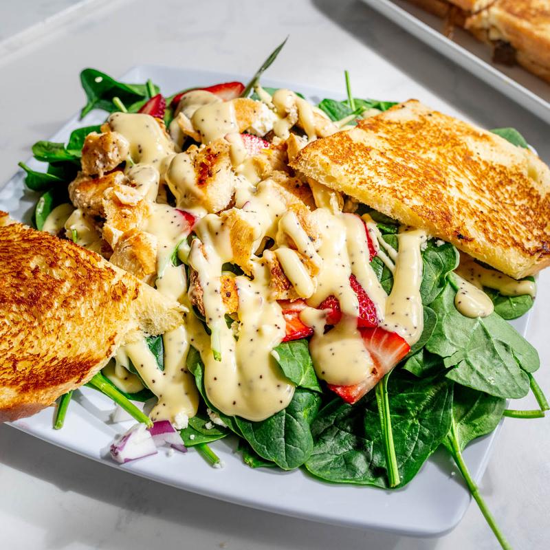 baby spinach, sliced strawberries, candied pecans, red onions, feta, poppyseed dressing